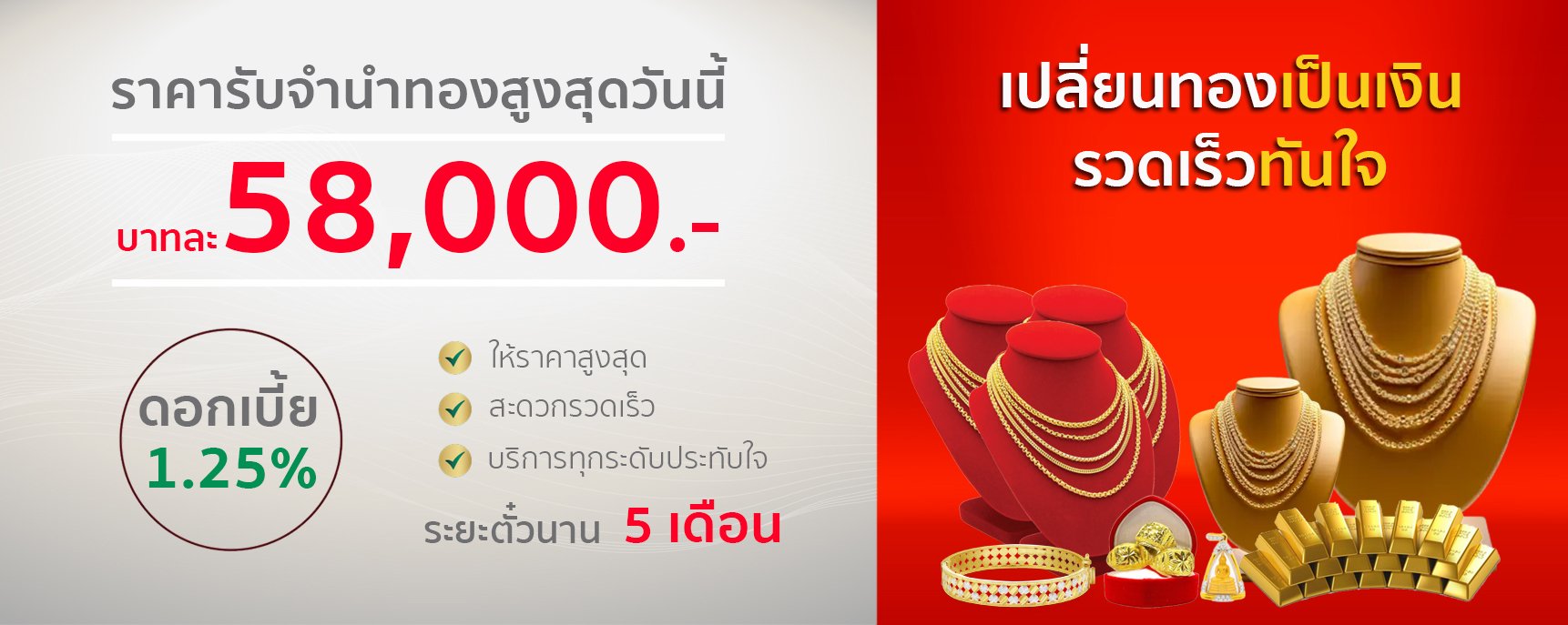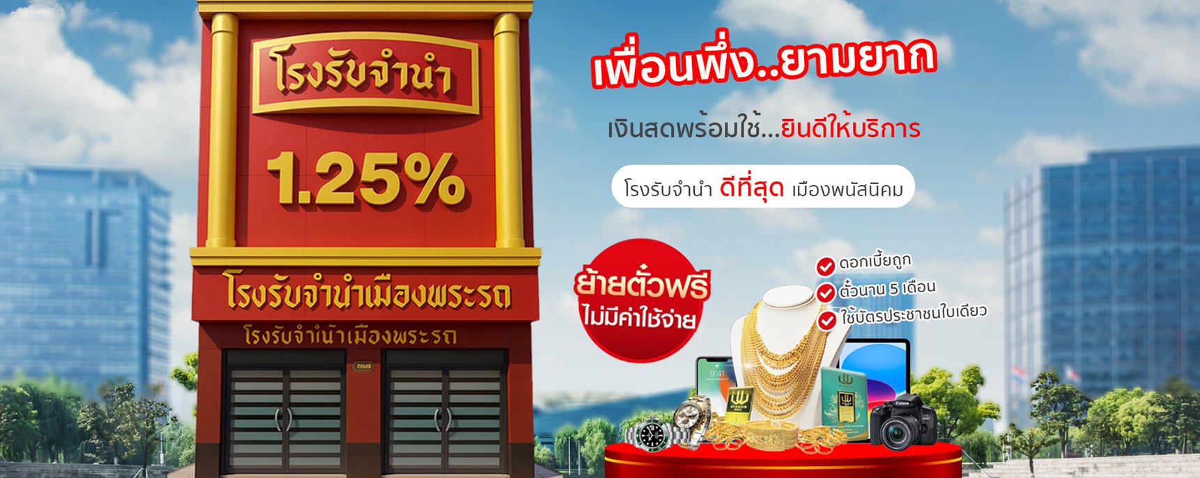 โรงรับจำนำเมืองพระรถ ให้บริการเงินด่วนด้วยการรับจำนำทรัพย์หลากหลายประเภททั้งทองคำแท่ง ทองคำรูปพรรณต่างๆ เครื่องประดับเพชร-พลอย นาฬิกา สินค้าแบรนด์เนม สินค้าไอที เครื่องใช้ไฟฟ้านานาชนิด